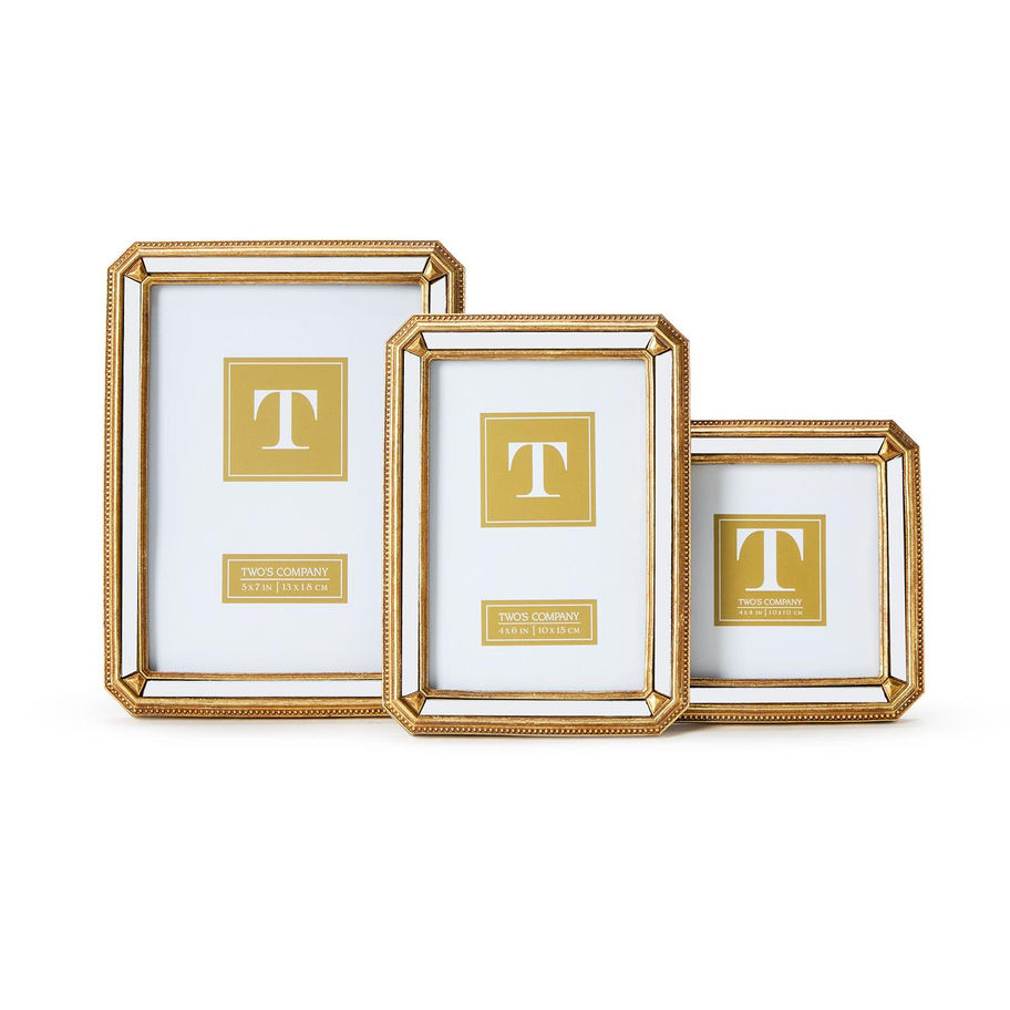 Showcase your cherished memories with the elegant Reflections Beveled Mirror Photo Frames. Each frame features a beveled mirror design that adds sophistication to any space. Versatile display options: 4"x4" stands vertically, while 4"x6" and 5"x7" can stand vertically or horizontally.